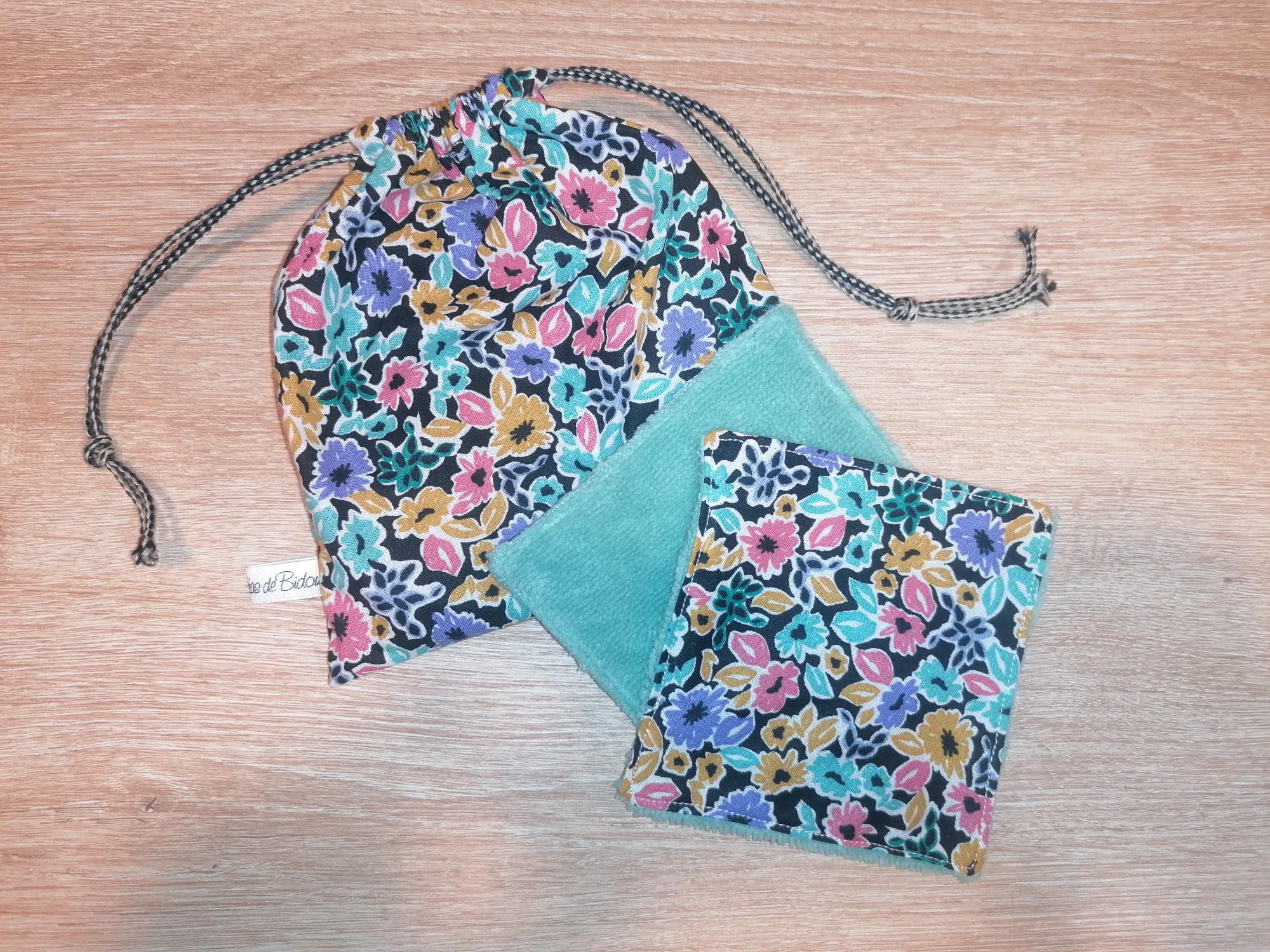 Pochon 7 lingettes – Fleurs fond noir / Bleu piscine