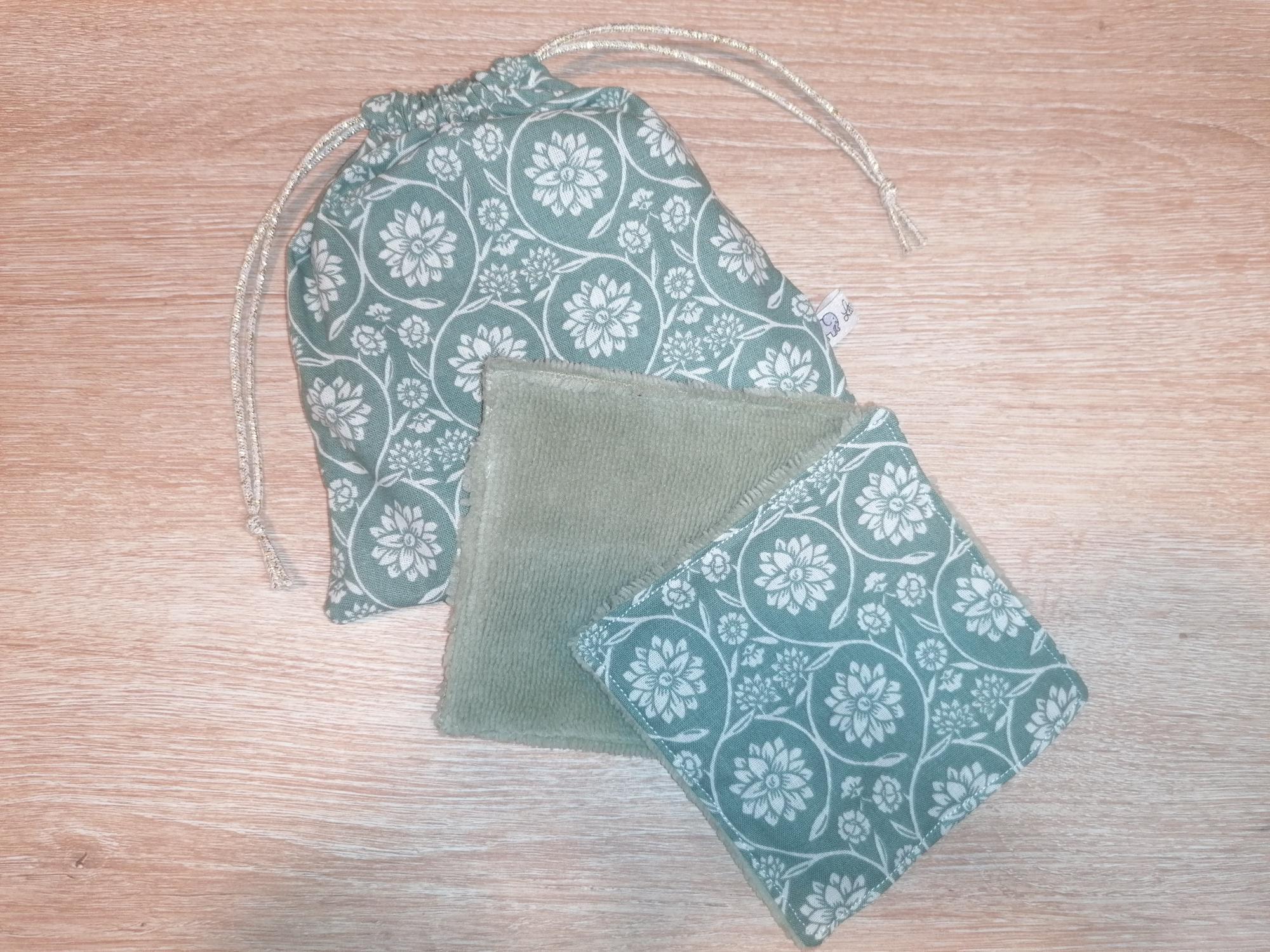 Pochon 7 lingettes – Fleurs vintage vert / vert