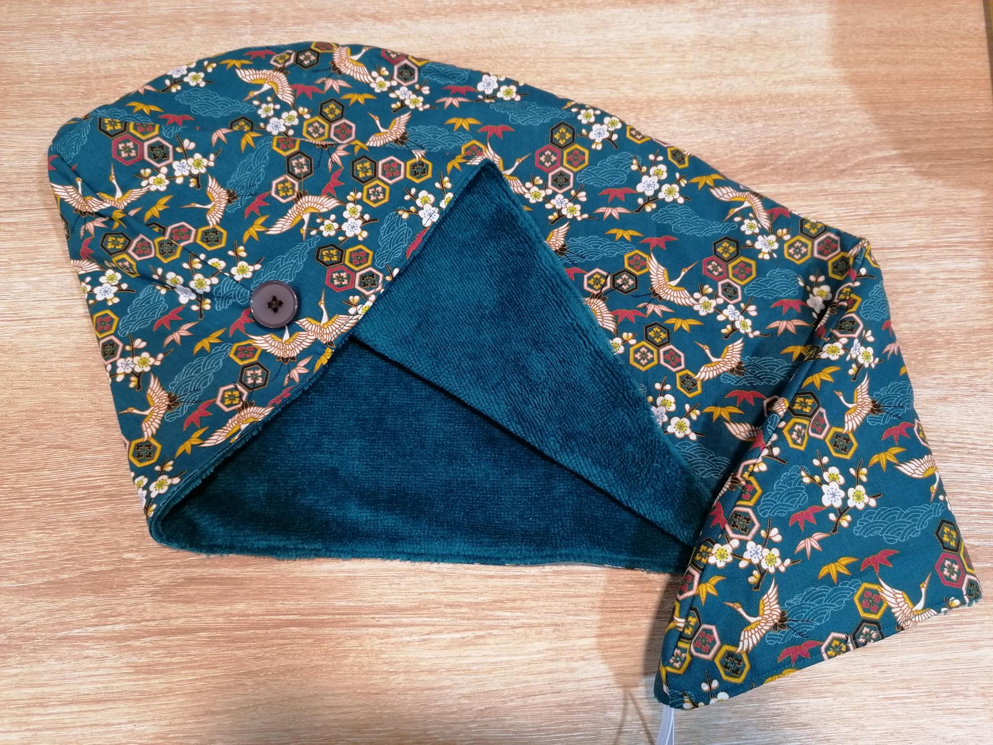 Serviette de cheveux – Cygnes bleu / éponge bambou bleu paon