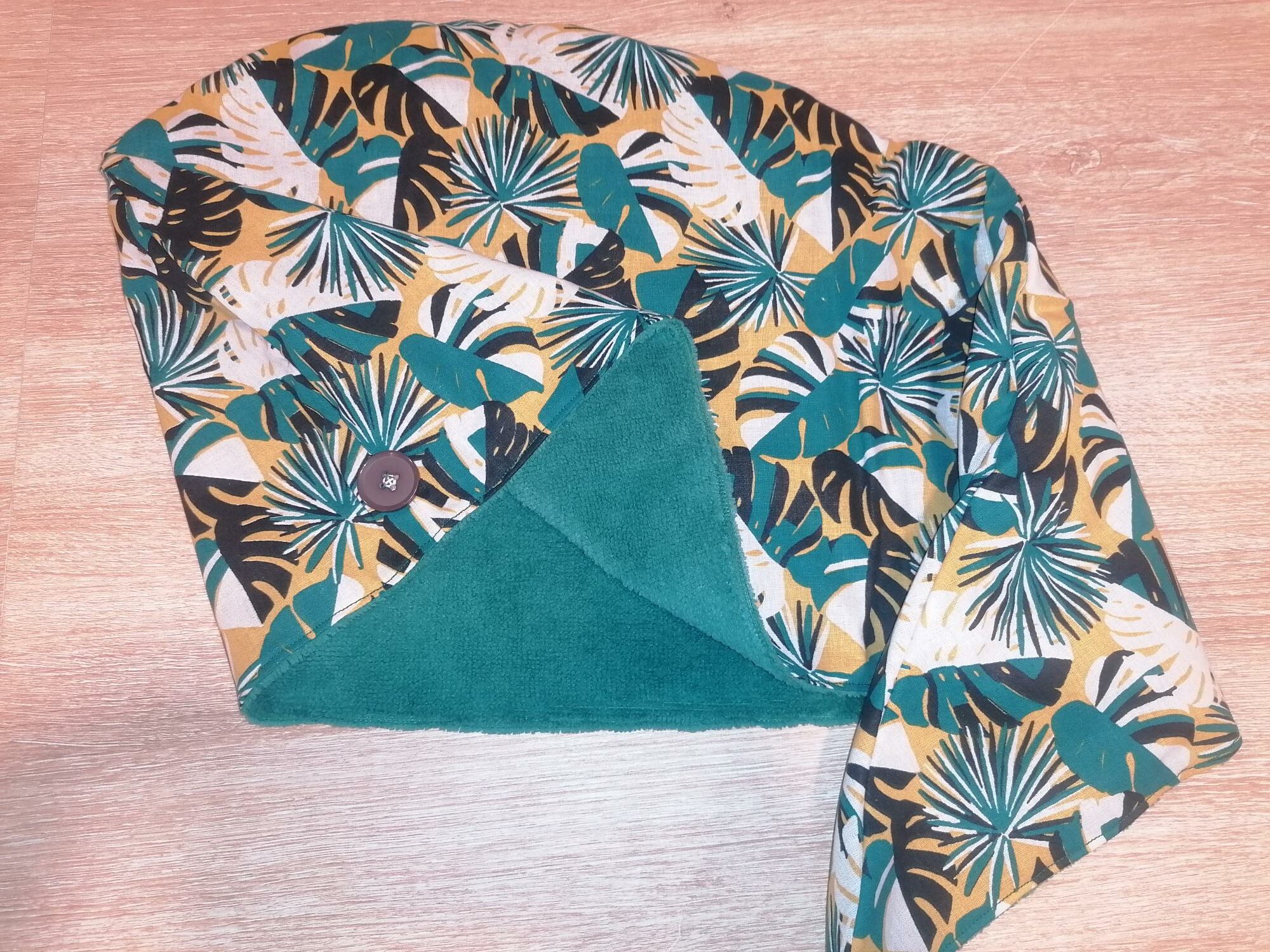 Serviette de cheveux – Feuillage turquoise moutarde / éponge bambou bleu turquoise