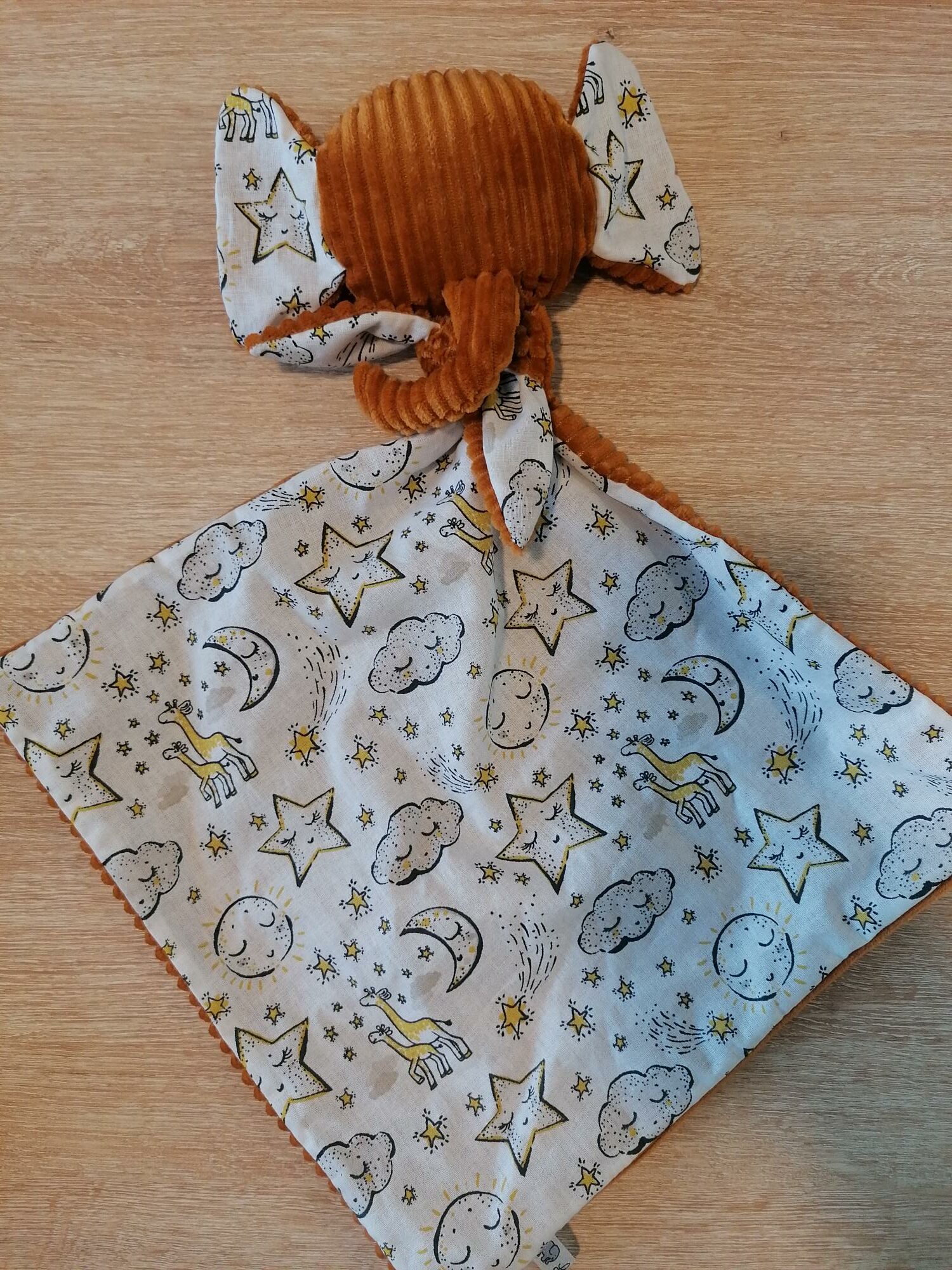 Doudou « Lenny l’éléphant » – Motif Etoiles lunes / jaune.