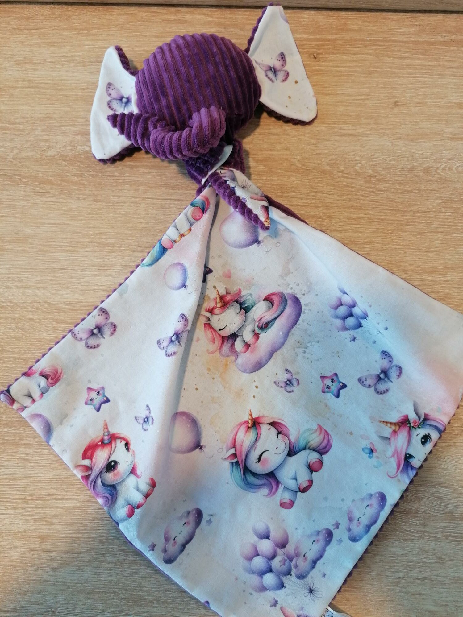 Doudou « Lenny l’éléphant » – Motif Licorne / violet.