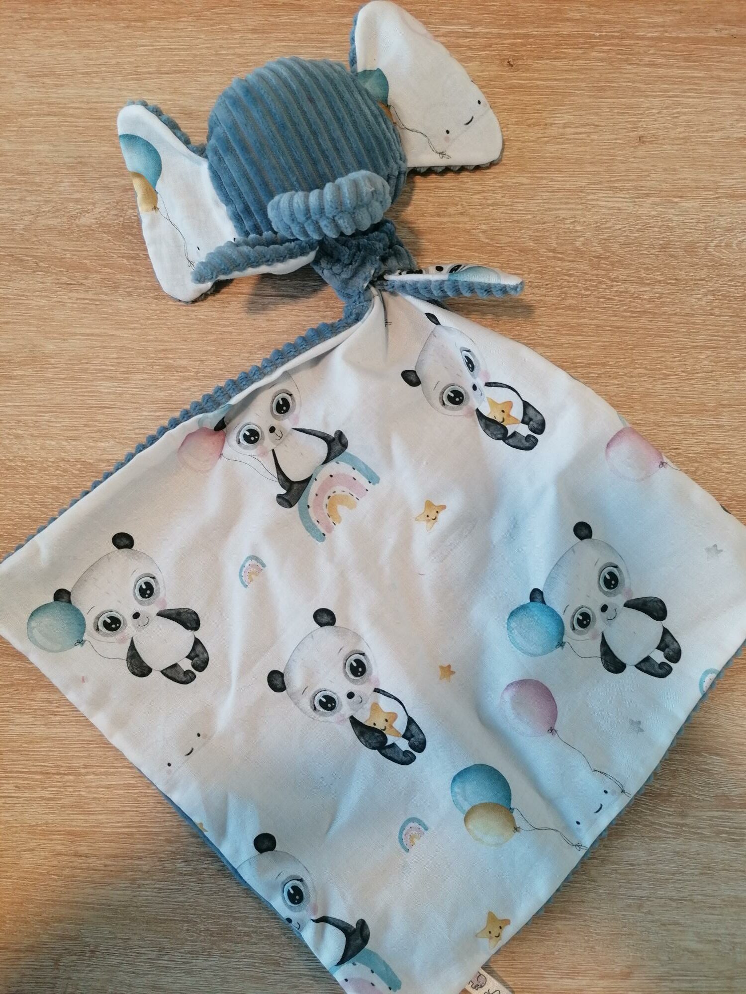 Doudou « Lenny l’éléphant » – Motif Panda / bleu.
