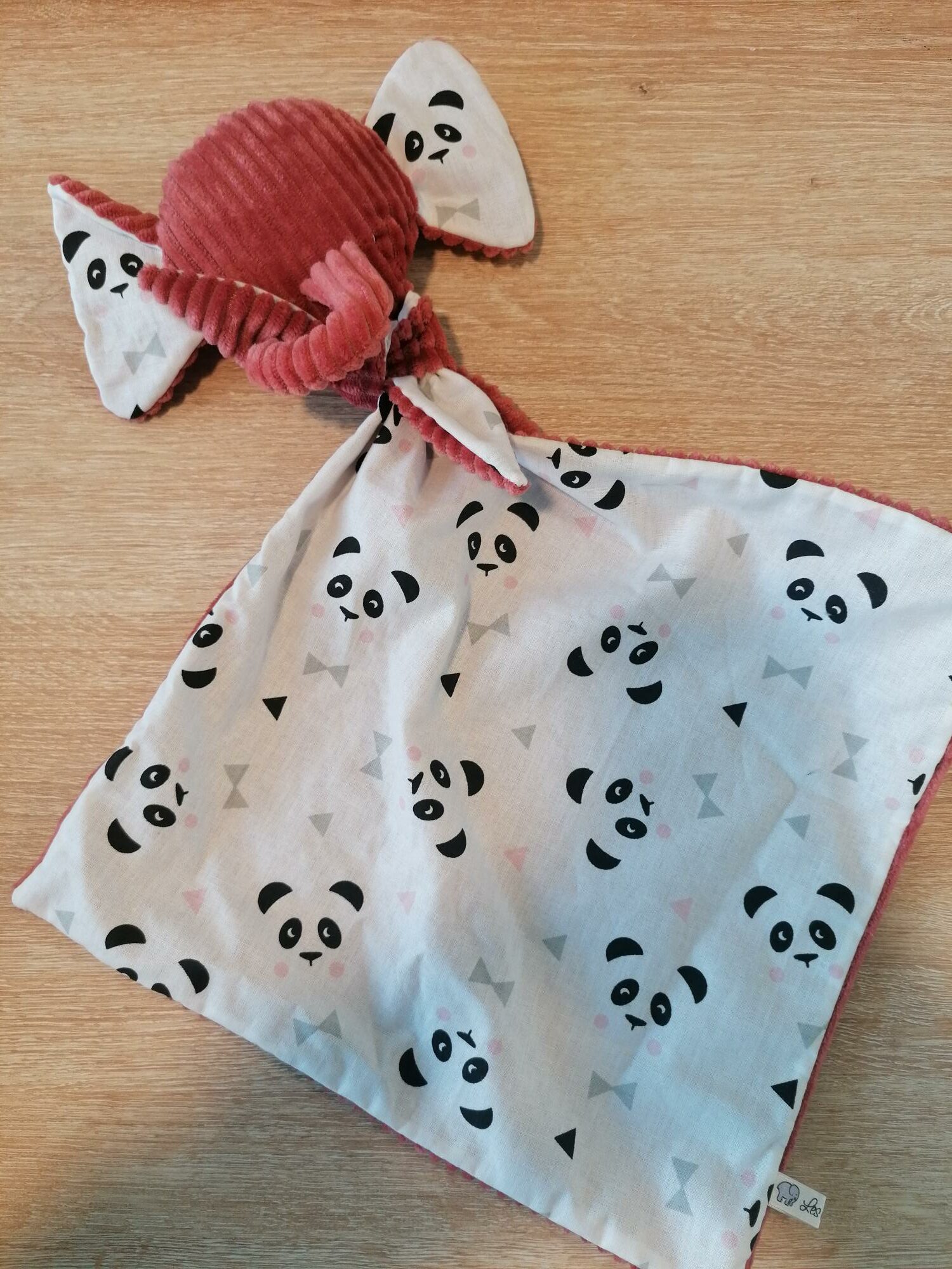 Doudou « Lenny l’éléphant » – Motif Panda / rose.