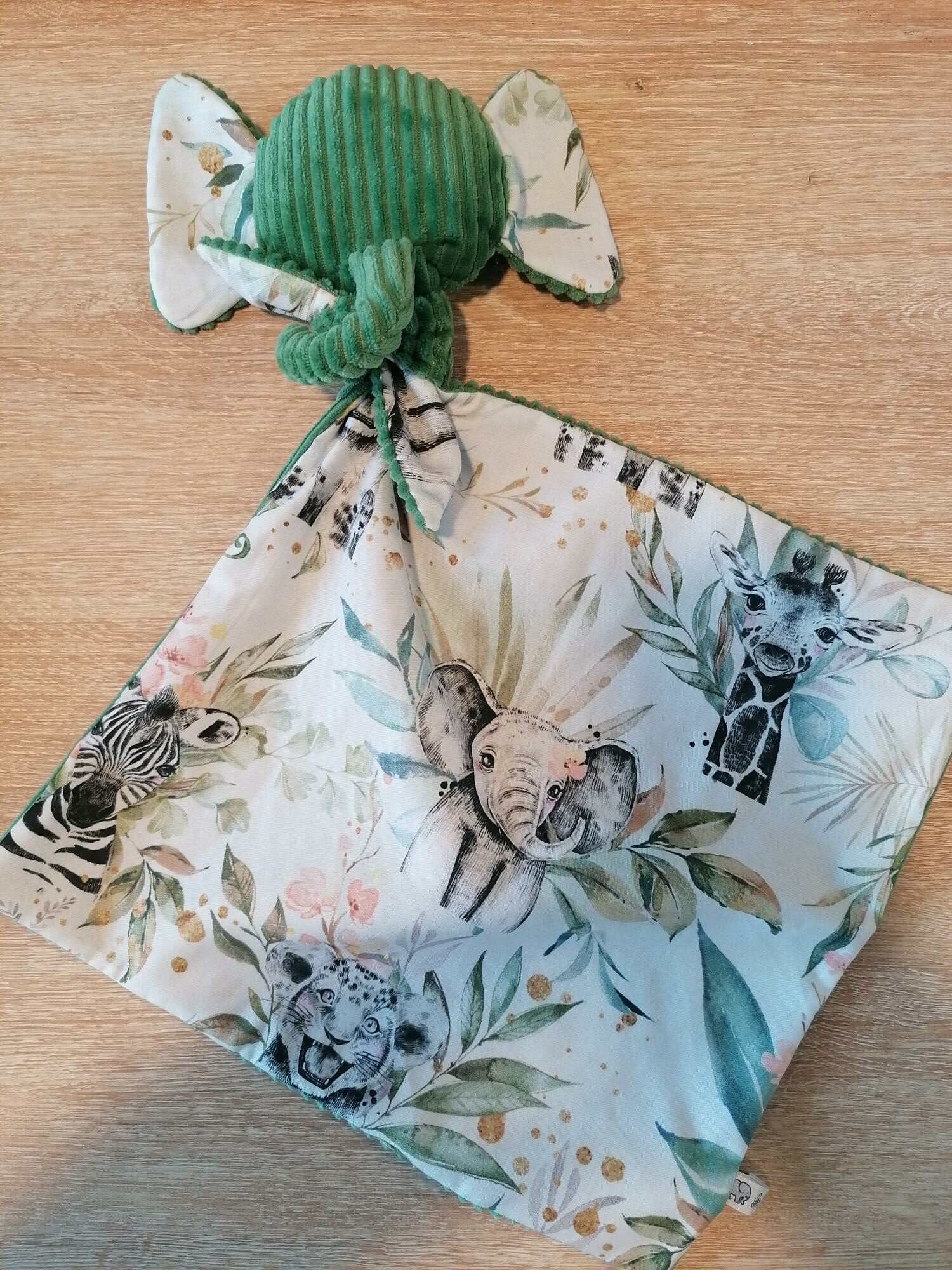 Doudou « Lenny l’éléphant » – Motif Savane vert / vert.