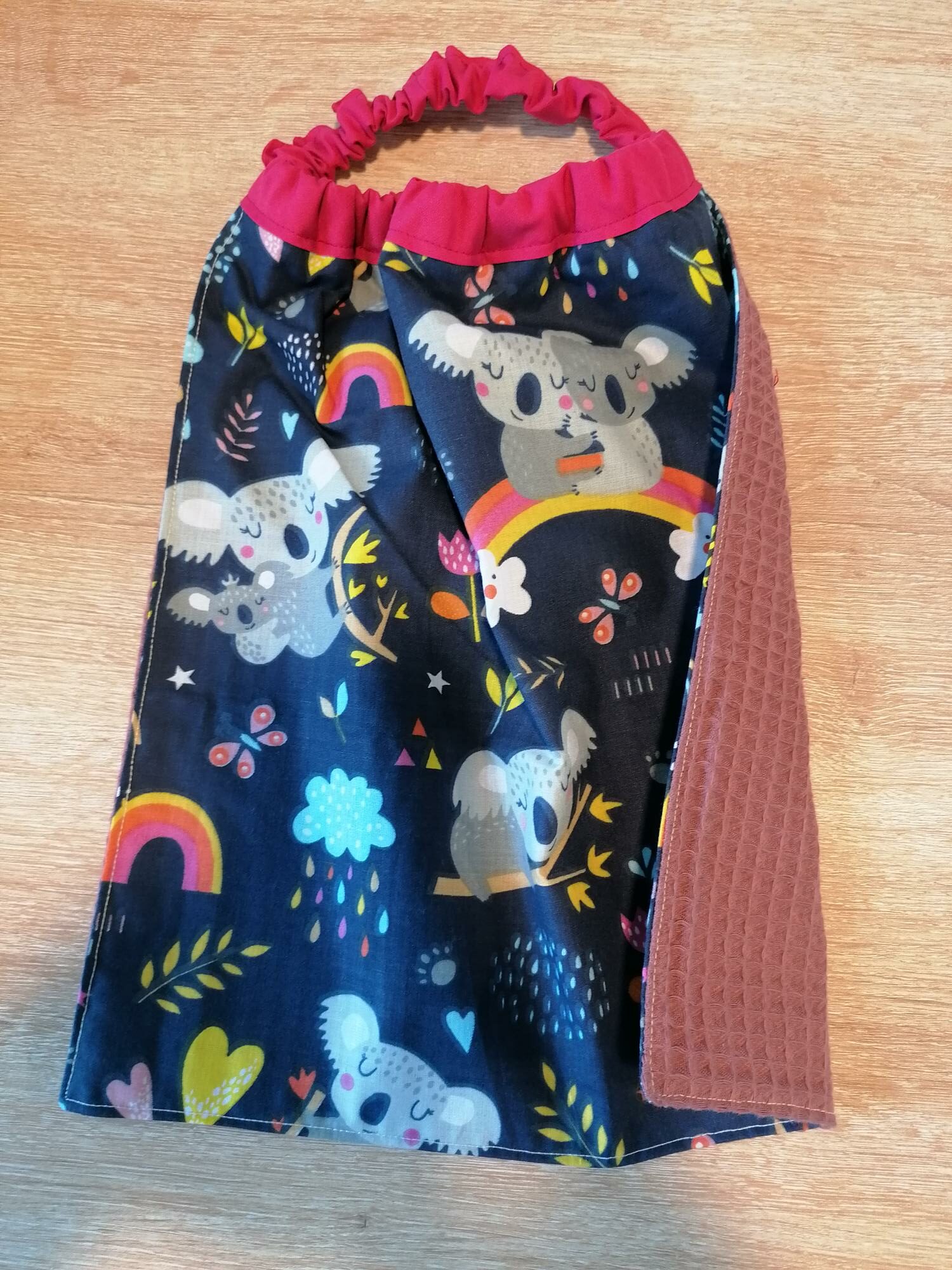 Serviette bavoir motif – Koala / vieux rose. Un côté en coton et l’autre en nid abeille.