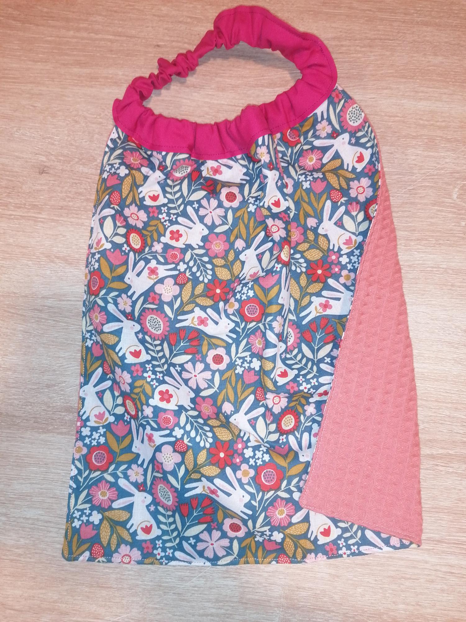 Serviette bavoir motif – Lapin fleuri/ corail. Un côté en coton et l’autre en nid abeille.