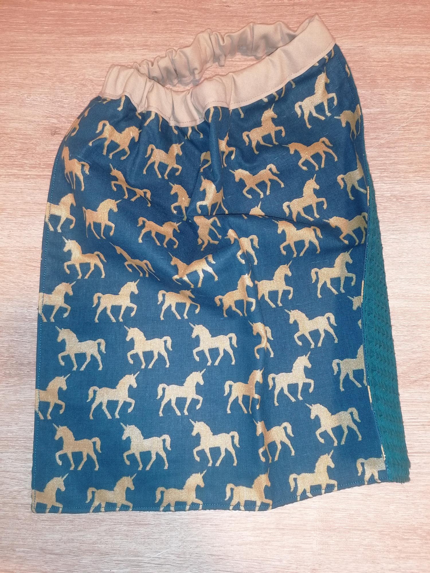 Serviette bavoir motif – Licorne or / bleu paon. Un côté en coton et l’autre en nid abeille.